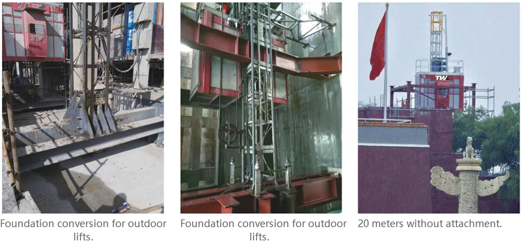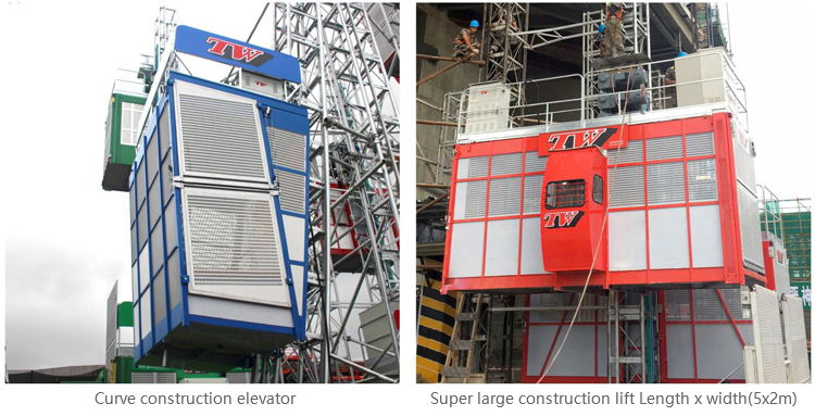 SC SERIES SPECIAL MODELS SC800G double mast construction lifts: 1. double guide rail structure, elevator adopts frequency conversion control and runs smoothly. 2. special speed limiting device, synchronize and stop both ends of a speed limiter. 3. super large cage for large and heavy cargo.